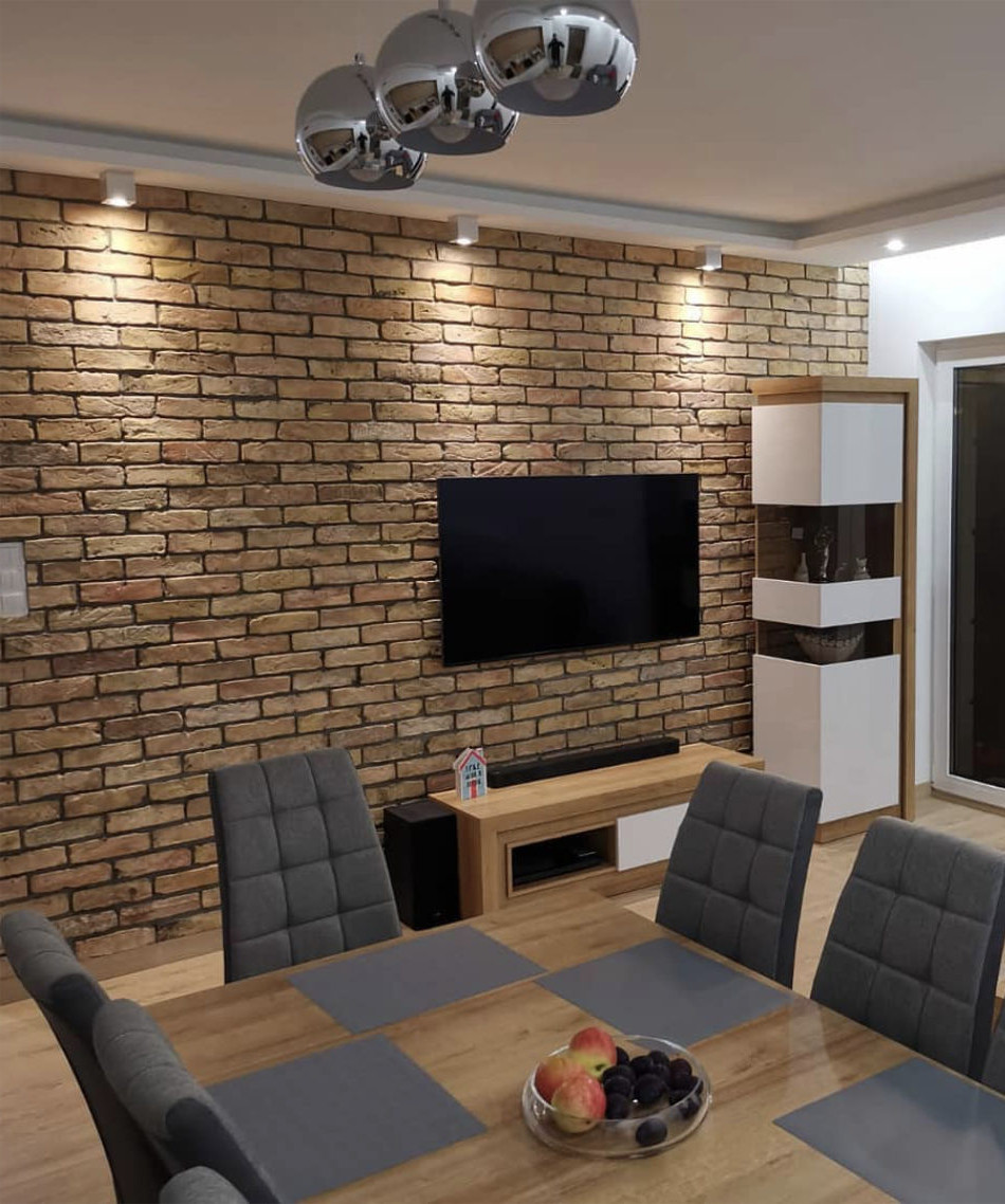 Płytki z cegły na ścianę z odzysku, w jasnym, ceglano-piaskowym kolorze i kształcie klasycznych prostokątów. Rzemieślnicza obróbka gwarantuje wysoką trwałość i wytrzymałość produktu, a także sprawia, że poszczególne sztuki różnią się od siebie pod względem kształtu, faktury czy odcienia. Inspirowana naturą cegła na ścianę wnosi do każdego pomieszczenia ciepło i przytulność, a klasyczna estetyka jest ponadczasowa i komponuje się z wnętrzami urządzonymi w różnych stylach. Unikalny materiał jest bardzo komfortowy i bezpieczny w użytkowaniu dzięki brakowi ostrych krawędzi oraz szkodliwych substancji chemicznych.